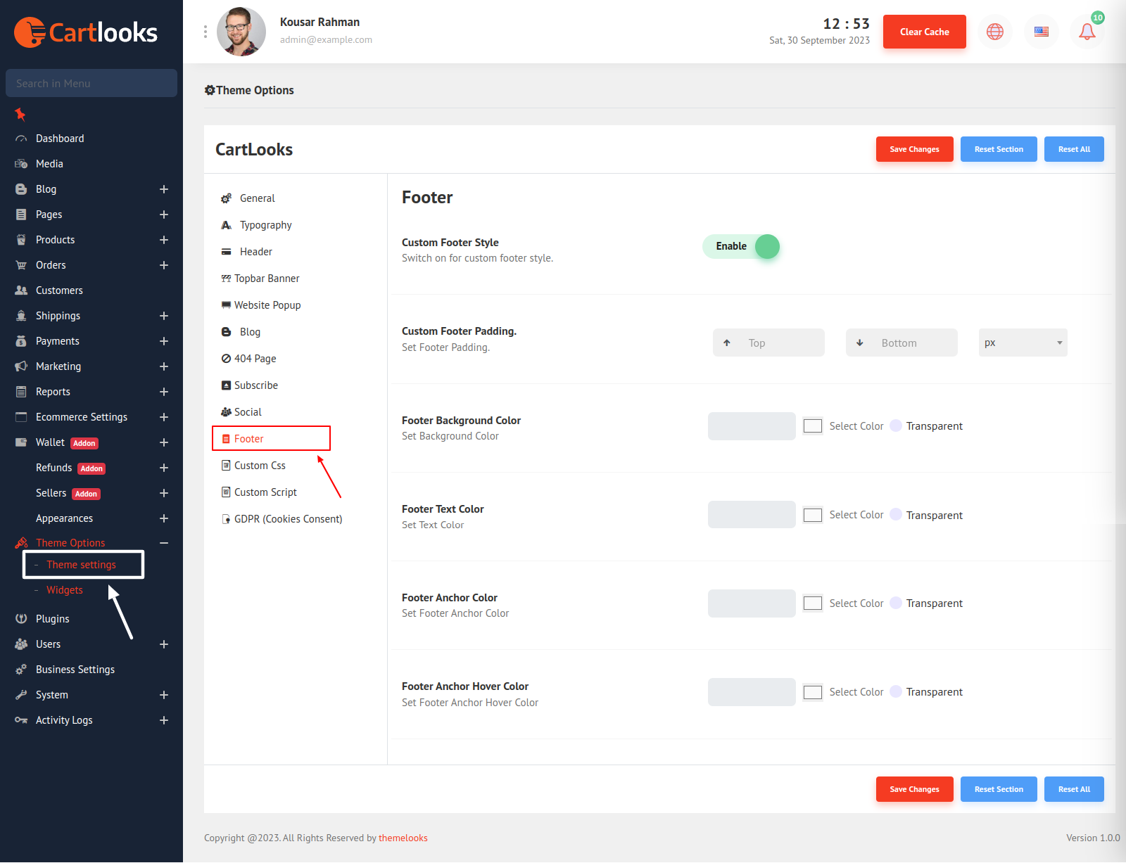 Click Save Changes to save theme options. Click Reset Section to reset only this section. Click Reset All to reset all theme options.
