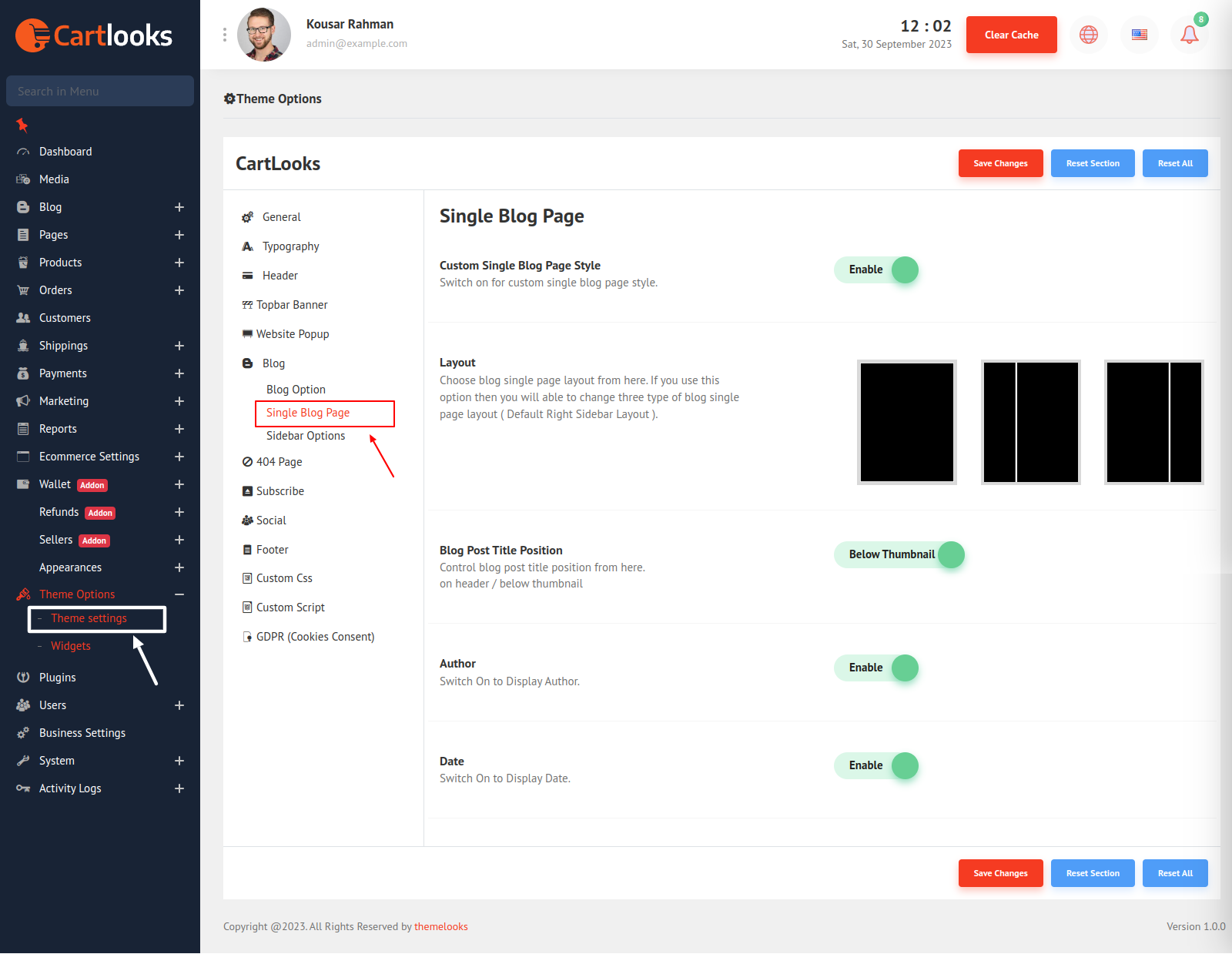 You can customize the Single Blog Page as you like. Follow Theme Options > Theme Settings. Click Single Blog Page from the Blog tab, and the Single Blog Page field will appear.
