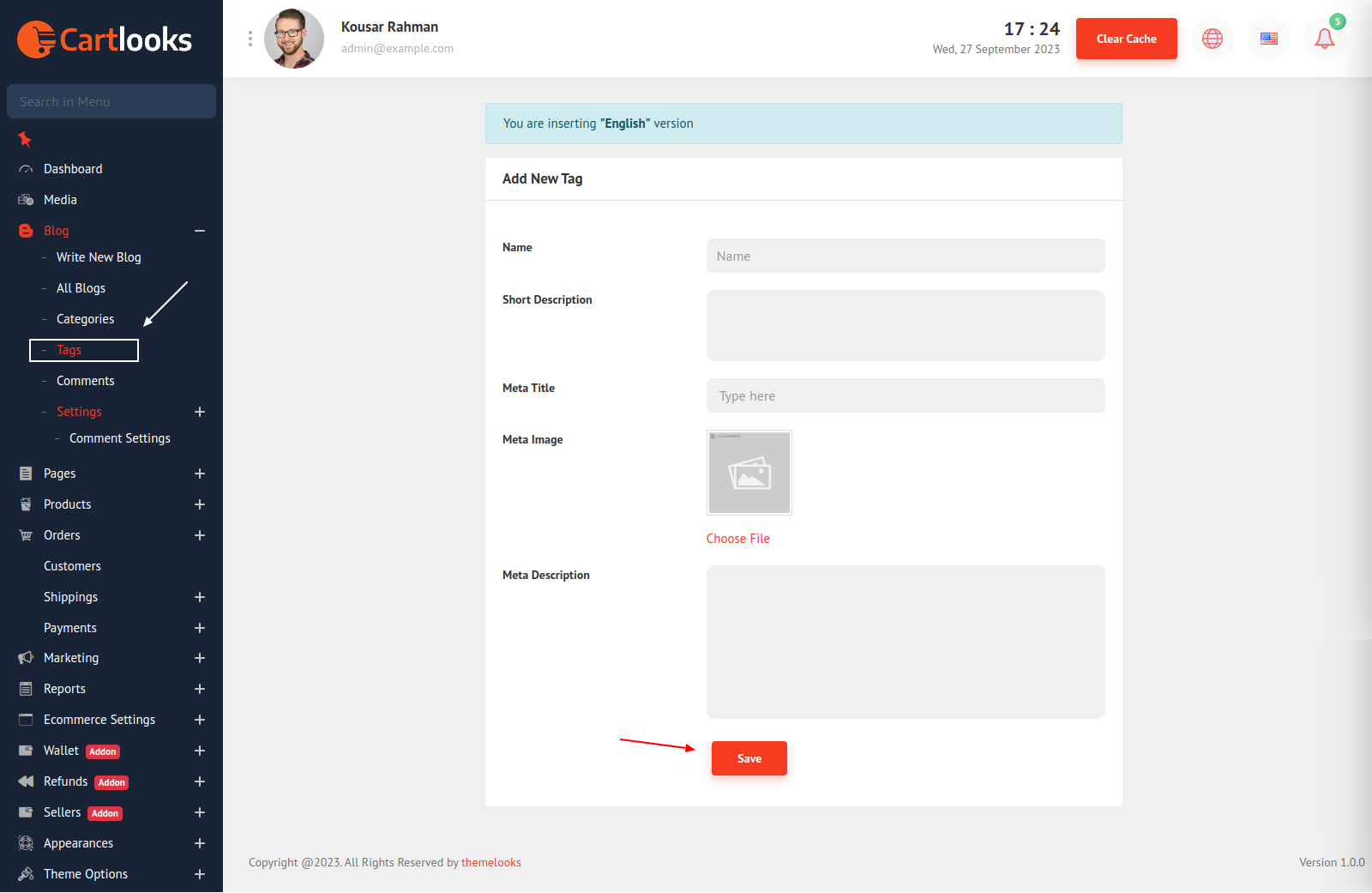 To create a new tag click Add Blog Tag button and you will be redirected to another page. Here you can give a name and edit the permalink and set SEO information.