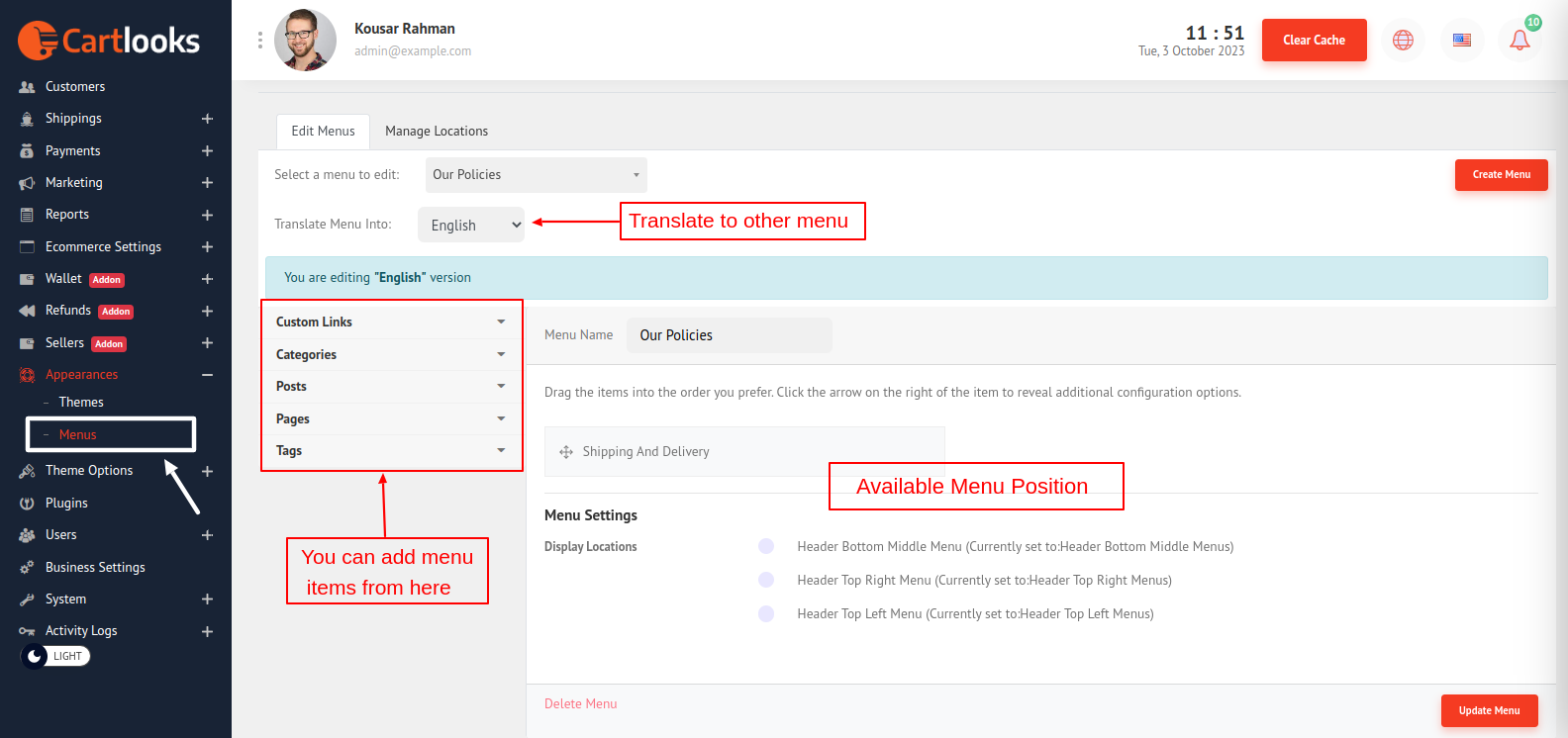 - Here on this page, you can create a new menu by clicking Create Menu. Then an interface like the below image will appear and you can set the menu name, select the menu location if you want, and click save menu.