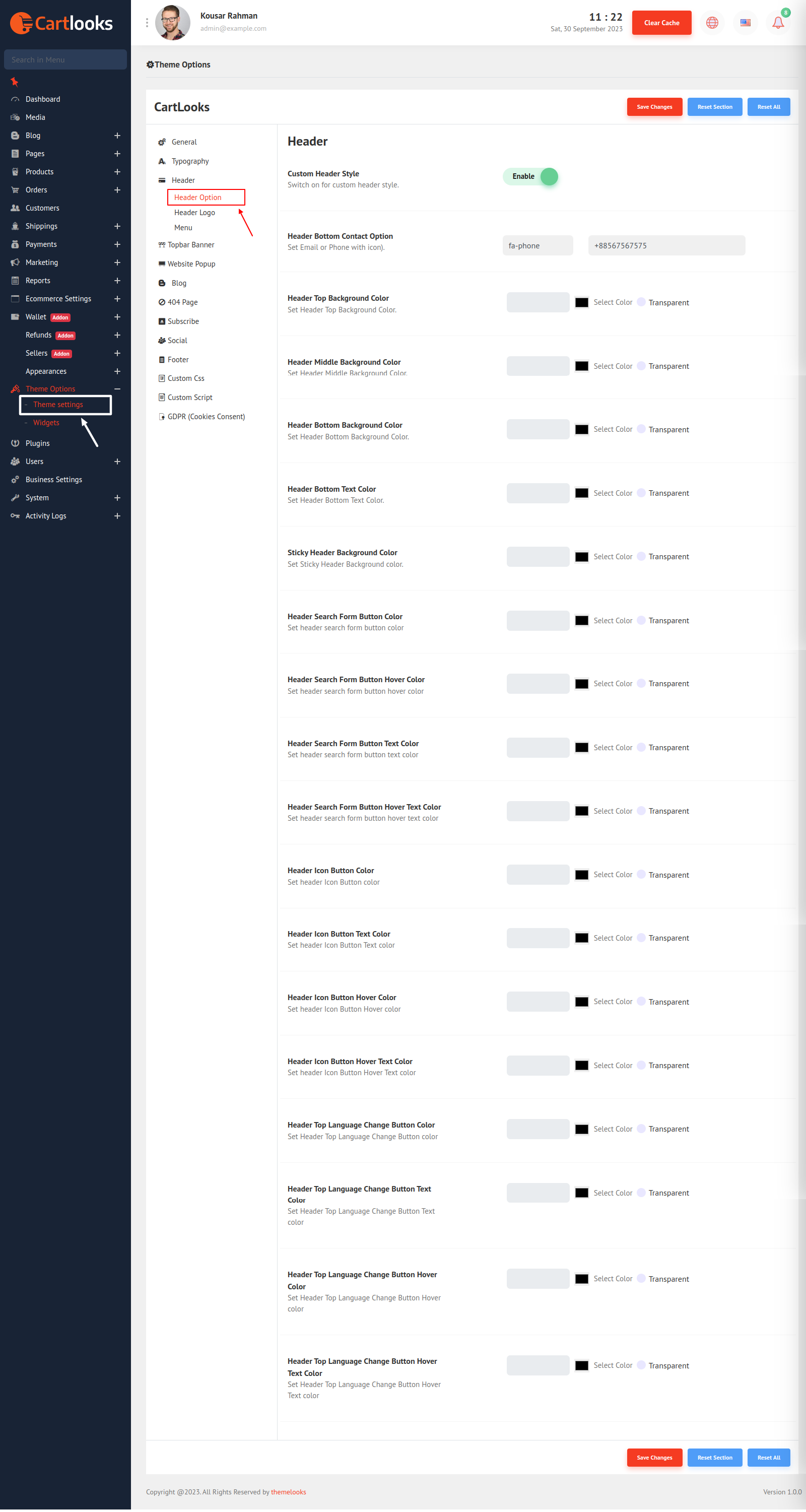 Click Save Changes to save theme options. Click Reset Section to reset only this section. Click Reset All to reset all theme options.
