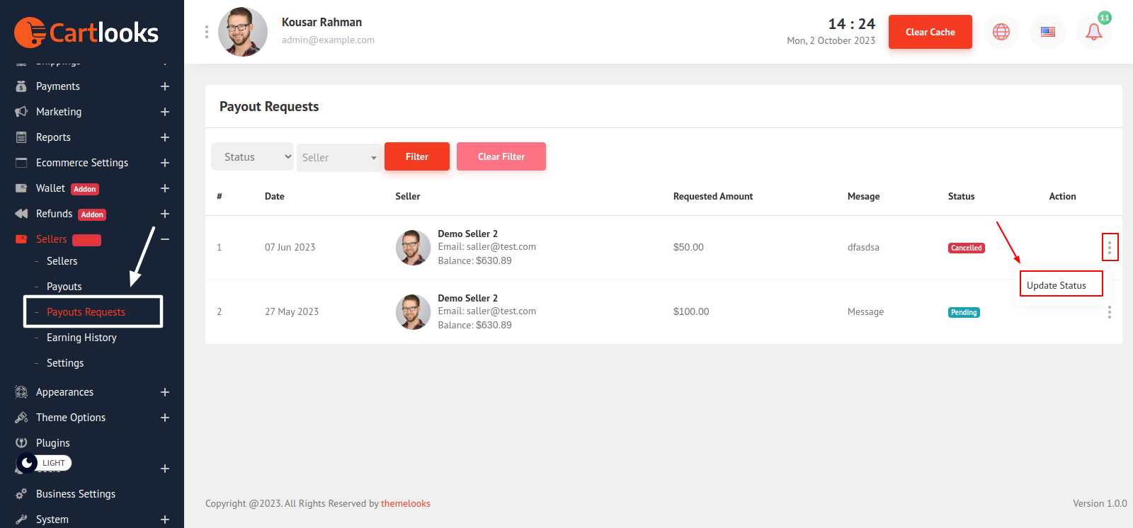 If you click Details From the action column dot(.) a modal will appear, where you can accept or cancel the payout request.
