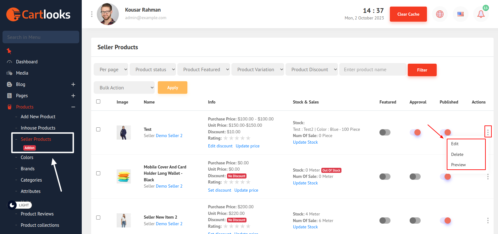 Here you can find all the seller's products. You can handle product approval or publish status. Also, Filter Products, and you can edit product information.
