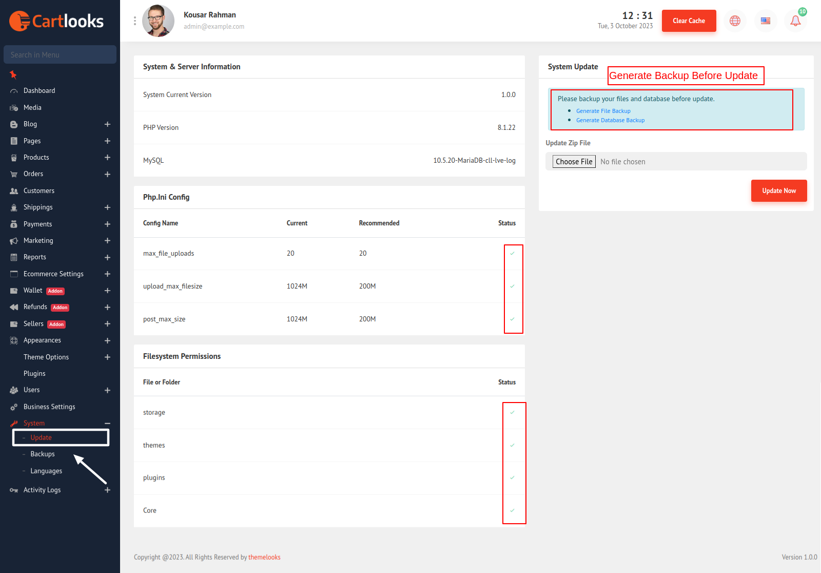 From The Left side first, you save to check if all statuses are complete. PHP.ini Configuration and Filesystem Permissions. Then take a backup of your files and database, and upload the updates.zip file. your system will be updated.